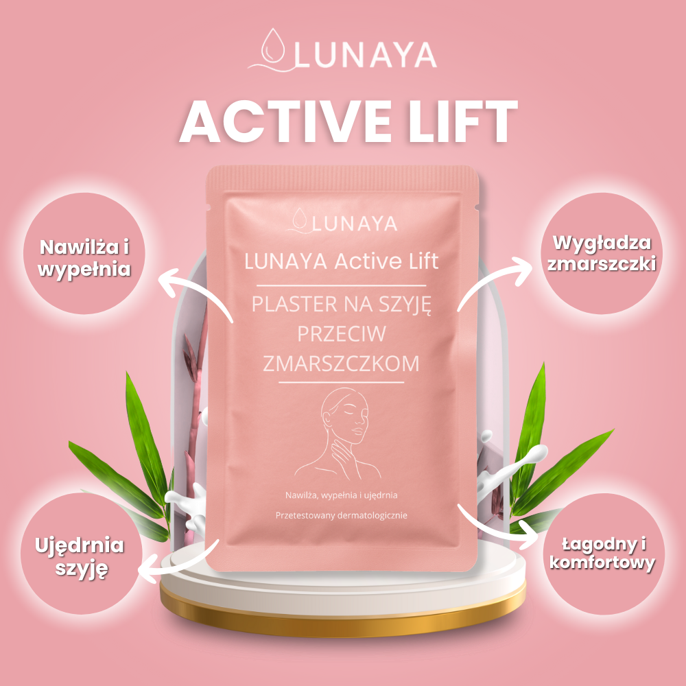 Plaster LUNAYA Active Lift jest nasączony 25 ml silnie działających składników aktywnych, starannie dobranych pod kątem delikatnej skóry szyi.